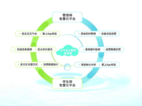 此外,榮事達著眼校園直飲水的互聯網化建設,依托先進的云端大數據平臺、無線網絡體系和智能一卡通技術等,創新打造ultraWiFi智慧管理系統,系統直連ultraWiFi凈水主機、開水器、飲水機等終端定制設備,實現精細化管理。學生在使用中不僅能查詢飲水消費記錄、在線報修設備、與校友交流等,還能擁有多元化充值方式選擇,充分享受快捷的智能化飲水體驗。 同時設備運營商也可通過電腦或手機APP端口接入云數據平臺,異地監測工程運行狀況,實時掌握水電成本、消費收益、設備狀態等數據信息,日常管理更簡單。