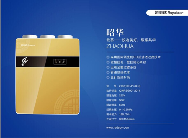 金秋,是碩果累累、滿載喜悅的季節。榮事達水工業公司繼“梅蘭竹菊”中國風主題系列產品之后再度創新突破,隆重推出了新品——“昭華”凈水機。“昭華”被譽為凈水機中的“iPhone 6”,是榮事達產品研發的又一次華麗升級!它采用國際尖端科技的RO反滲透膜濾芯和管道快接技術。產品擁有RO反滲透膜的五級全能過濾系統,能過濾掉水中的重金屬、病毒、細菌等有害物質;而各級濾芯、插頭均采用直插式設計的管路快接技術,杜絕了螺紋式濾芯、接頭受水錘現象長期影響而易變形漏水的可能。“姣冶美好,耀耀其華”,新品“昭華”秉承榮事達一貫的傳統,堅持以文化豐富內涵的創意,外觀設計堂皇大氣,配色高貴典雅,在其實用功能外給用戶獨特的美感享受和人文關懷。一個有文化底蘊、不斷創新的企業才是有生命力的企業,榮事達重量級新品“昭華”的亮相,是榮事達產品力的全面彰顯。據銷售部門反映,“昭華”上市給下半年的市場注入了新鮮活力,產品受到代理商的普遍贊譽,甚至帶動了全系產品的訂單總量。- [關閉] [打印]