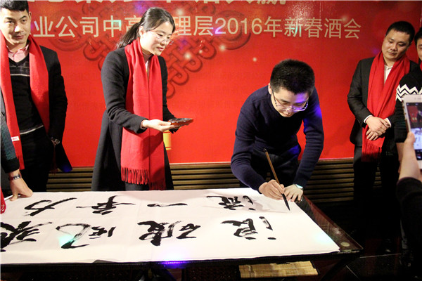 酒會(huì)上,雷鳴董事長(zhǎng)作了重要講話,向全體中高管理層成員拜年,感謝全體成員一年來(lái)為公司發(fā)展辛苦的付出與努力,并希望新的一年大家共同努力,讓公司繼續(xù)大展宏圖、欣欣向榮。之后,各分公司、事業(yè)部、部門(mén)紛紛以創(chuàng)新、幽默、多樣的方式向全體參會(huì)人員拜年。生產(chǎn)制造中心以喜慶的春聯(lián)為依托,在表達(dá)新春祝福的同時(shí),還帶來(lái)了印有“安全第一 質(zhì)量為本”字樣的員工集體簽名橫幅,為確保產(chǎn)品質(zhì)量作出承諾;凈水家電事業(yè)部總經(jīng)理王悅生的現(xiàn)場(chǎng)即興題字,用丹青妙筆表達(dá)了其部門(mén)成員奮勇?tīng)?zhēng)先的目標(biāo)和信心;工程事業(yè)部總經(jīng)理劉東帶領(lǐng)其部門(mén)成員所采用的“三句半”拜年方式贏得了滿堂喝彩;財(cái)務(wù)部與企劃部共同合作的“異口同聲”有獎(jiǎng)競(jìng)猜創(chuàng)意拜年,更是傳達(dá)了“榮事達(dá)一家親”的美好寓意。