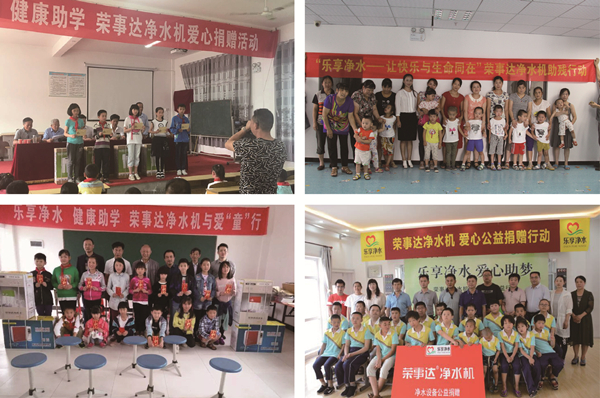 2016年,榮事達水工業公司走進紅色革命老區——金寨縣,攜手金寨希望公益服務中心及地方公益協會共同發起“‘給山區孩子一杯水’——援建金寨縣中小學凈水設備公益項目”,為金寨縣所有中小學援建直飲水系統400多套,全面呵護學生飲水健康。該項目被全國文明辦評為“全國百佳公益項目”。